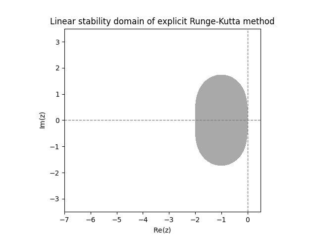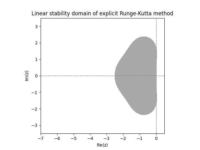 \(\text{ }\)Linear stability domain. Imagine applying a general numerical method to the \(\mathbb{C}\)-valued IVP \[y'=\lambda y,\quad t\ge0,\quad\quad y(0)=1,\tag{12.11}\] for a complex number \(\lambda.\) The exact solution is \(y(t)=e^{\lambda t},\) which tends to zero as \(t\to\infty\) for any \(\lambda\) with \(\mathrm{Re}\lambda<0.\) A numerical method with a given step-size applied to the IVP may or may not produces approximations \(y_{n}\) such that \(y_{n}\to0.\) The linear stability domain is defined as the subset \(\mathcal{D}\subset\mathbb{C}\) of the complex plane, so that if the coefficient \(\lambda\) and step-size \(h\) are such that \(h\lambda\in\mathcal{D},\) then the approximations satisfy \(y_{n}\to0.\)