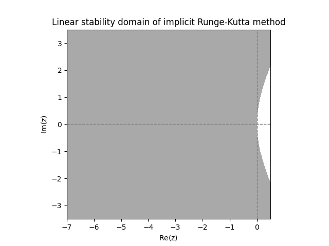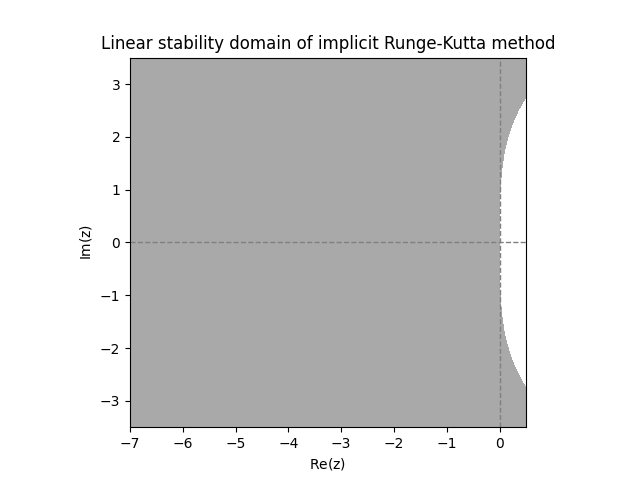 Examining the above diagrams, we see that the ERKs have quite a small linear stability domain, and have no chance of being \(A\)-stable. Both IRKs however appear to be \(A\)-stable.