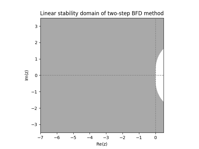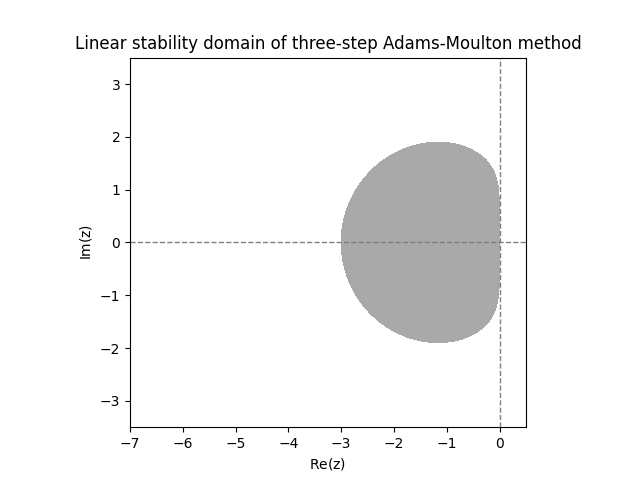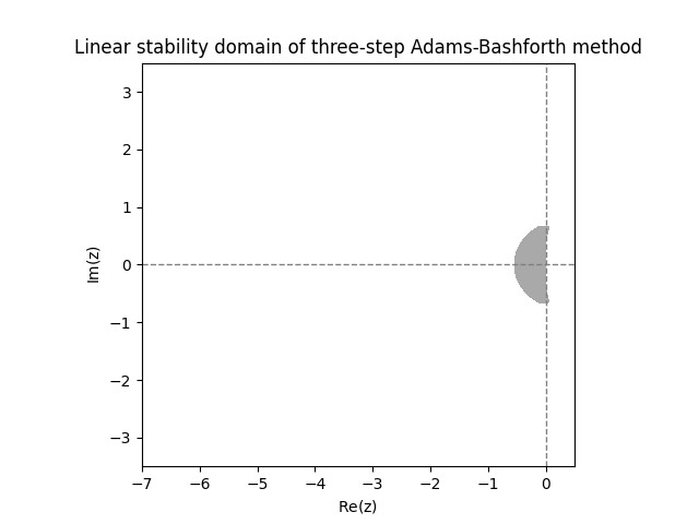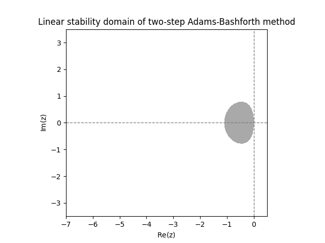 \(\text{ }\)Deriving linear stability domain.The general \(s\)-step linear multistep method ([eq:ch9_general_multistep]) applied to the IVP ([eq:linear_stabiility_domain_test_ODE]) yields \[\sum_{m=0}^{s}a_{m}y_{n+m}=h\lambda\sum_{m=0}^{s}b_{m}y_{n+m}.\] Let us rewrite it as \[\sum_{m=0}^{s}(a_{m}-h\lambda b_{m})y_{n+m}=0.\] This is a linear difference equation, as studied in Section 10.3. Recall that the general solution of such a difference equation involves the roots of its characteristic polynomial \[p(w)=\sum_{m=0}^{s}(a_{m}-h\lambda b_{m})w^{m}.\] Indeed letting \(w_{1},\ldots,w_{k}\) be the distinct roots with respective multiplicities \(m_{1},\ldots,,m_{k},\) the formula for the general solution is \[y_{n}=\sum_{i=1}^{k}q_{i}(n)w_{i}^{n},\] where \(q_{i}\) is an arbitrary polynomial of degree at most \(m_{i}-1.\) The r.h.s. converges to zero as \(n\to\infty\) only if \(|w_{i}|<1\) for all \(i\) such that \(q_{i}\ne0.\) Since we allow for any possible starting values for \(y_{1},\ldots,y_{s-1}\) we can not assume that any of the \(q_{i}\) vanish. Thus the linear stability domain is \[\mathcal{D}=\left\{ z\in\mathbb{C}:\text{all roots of }\sum_{m=0}^{s}\left(a_{m}-zb_{m}\right)w^{m}\text{ have norm less than }1\right\}\] \(\text{ }\)Investigating linear stability domains graphically. Computing the roots numerically for a grid of \(z\)-s one can plot the linear stability domains of any fixed multistep method. The next figure shows the result for the Adams-Bashforth methods with \(s=2\) and \(s=3\) steps.