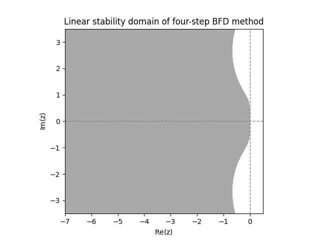 One may note that some of these methods have a linear stability domain that covers part of the complex plane with non-negative real part. This is not actually an advantage, because there the true solution of ([eq:linear_stabiility_domain_test_ODE]) diverges, while the numerical solution converges to zero.