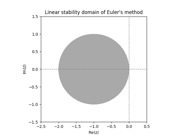 \(\text{ }\)Linear stability domain of Euler’s method. Applied to the IVP ([eq:linear_stabiility_domain_test_ODE]) Euler’s method produces the approximations \[y_{n}=(1+h\lambda)^{n}.\] Note that for a complex number \(a=re^{i\theta}\) we have \(a^{n}=r^{n}e^{in\theta},\) which tends to zero only if \(r<1.\) Thus \(y_{n}\) converges to zero only if \(\left|1+h\lambda\right|<1.\) Thus the linear stability domain of Euler’s method is \[\mathcal{D}=\left\{ z\in\mathbb{C}:\left|1+z\right|<1\right\} .\] This is the open ball of unit radius centered at \(-1\) (see Figure Figure 12.2).