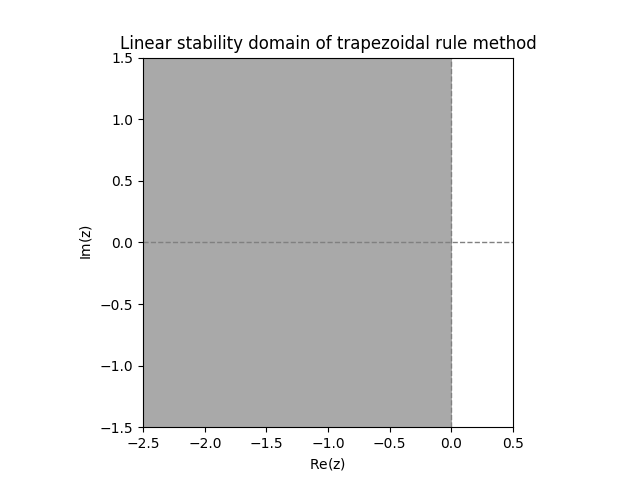\(\text{ }\)Linear stability domain of the trapezoidal rule method. Applying the trapezoidal rule method to the IVP ([eq:linear_stabiility_domain_test_ODE]) yields \[y_{n}=\left(\frac{1+\frac{1}{2}h\lambda}{1-\frac{1}{2}h\lambda}\right)^{n}.\tag{12.12}\] This tends to zero iff \(\left|\frac{1+\frac{1}{2}h\lambda}{1-\frac{1}{2}h\lambda}\right|<1,\) so the linear stability domain is \[\mathcal{D}=\left\{ z\in\mathbb{C}:\frac{\left|1+\frac{z}{2}\right|}{\left|1-\frac{z}{2}\right|}<1\right\} .\tag{12.13}\] Since \[\frac{\left|1+\frac{z}{2}\right|}{\left|1-\frac{z}{2}\right|}=\frac{\left(1+\frac{\mathrm{Re}z}{2}\right)^{2}+\left(\frac{\mathrm{Im}z}{2}\right)^{2}}{\left(1-\frac{\mathrm{Re}z}{2}\right)^{2}+\left(\frac{\mathrm{Im}z}{2}\right)^{2}}\] and the r.h.s. is \(<1\) precisely when \(\mathrm{Re}z<0,\) we see that \[\mathcal{D}=\left\{ z\in\mathbb{C}:\mathrm{Re}z<0\right\} \tag{12.14}\] (see Figure Figure 12.2). The trapezoidal rule has a much larger linear stability domain than Euler’s method.
