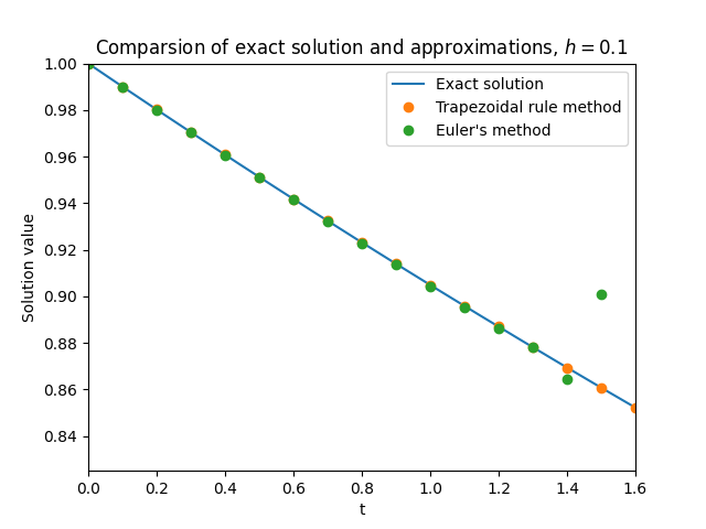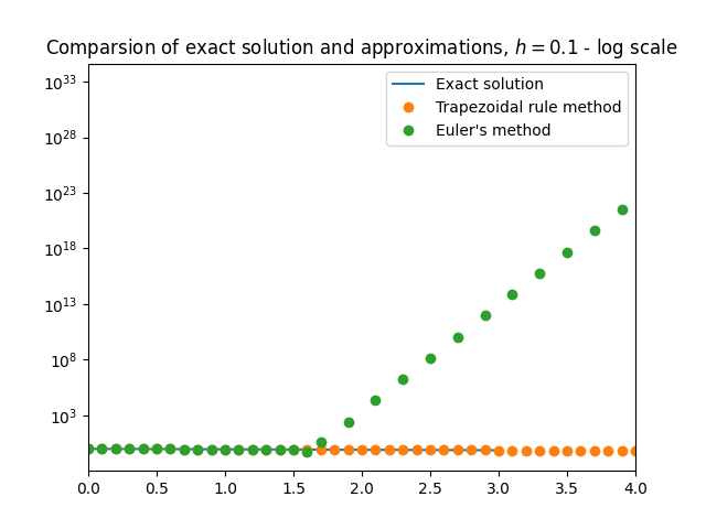 \(\text{ }\)Success of trapezoidal rule method. Let us now investigate the performance of the trapezoidal rule method applied to the IVP ([eq:ch12_stiff_ode_first_example]). Specializing the rule ([eq:ch9_trap_intro_rule]) to this ODE yields the implicit equation \[y_{n+1}=y_{n}+\frac{h}{2}(Ay_{n}+Ay_{n+1})\tag{12.8}\] for \(y_{n+1}\) in terms of \(y_{n}.\) In this simple case the equation can in fact be explicitly solved provided \(I-\frac{h}{2}A\) is non-degenerate, yielding \[y_{n+1}=\left(I-\frac{h}{2}A\right)^{-1}\left(I+\frac{h}{2}A\right)y_{n}.\] The approximations produced by the method are thus \[y_{n}=B^{n}y_{0}\quad\quad\text{where}\quad\quad B=\left(I-\frac{h}{2}A\right)^{-1}\left(I+\frac{h}{2}A\right).\] The basis that diagonalizes \(A\) also diagonalizes \(B,\) and \[\left(I-\frac{h}{2}D\right)^{-1}\left(I+\frac{h}{2}D\right)=\left(\begin{matrix}\frac{1-\frac{h}{2}100}{1+\frac{h}{2}100} & 0\\ 0 & \frac{1-\frac{h}{2}\frac{1}{10}}{1+\frac{h}{2}\frac{1}{10}} \end{matrix}\right),\] so \[B=V\left(\begin{matrix}\frac{1-\frac{h}{2}100}{1+\frac{h}{2}100} & 0\\ 0 & \frac{1-\frac{h}{2}\frac{1}{10}}{1+\frac{h}{2}\frac{1}{10}} \end{matrix}\right)V^{-1}.\] Therefore the approximations of the trapezoidal rule method can be written as \[y_{n}=V\left(\begin{matrix}\left(\frac{1-\frac{h}{2}100}{1+\frac{h}{2}100}\right)^{n} & 0\\ 0 & \left(\frac{1-\frac{h}{2}\frac{1}{10}}{1+\frac{h}{2}\frac{1}{10}}\right)^{n} \end{matrix}\right)V^{-1}y_{0}=x_{1}\left(\frac{1-\frac{h}{2}100}{1+\frac{h}{2}100}\right)^{n}+x_{2}\left(\frac{1-\frac{h}{2}\frac{1}{10}}{1+\frac{h}{2}\frac{1}{10}}\right)^{n}.\] Now the terms on the r.h.s. converge to \(0\) as \(n\to\infty,\) provided \[\left|\frac{1-\frac{h}{2}100}{1+\frac{h}{2}100}\right|<1\quad\quad\text{and}\quad\quad\left|\frac{1-\frac{h}{2}\frac{1}{10}}{1+\frac{h}{2}\frac{1}{10}}\right|<1.\tag{12.9}\] Since \[1\ge\frac{1-\frac{h}{2}100}{1+\frac{h}{2}100}=1-\frac{h100}{1+\frac{h}{2}100}>1-\frac{h100}{\frac{h}{2}100}=-1,\] we see that both inequalities in ([eq:ch12_stiff_trap_stability_cond]) in fact hold for all \(h>0\)! Thus the difference equation ([eq:ch12_stiff_ode_trap_diff_eq]) has “stable” solutions for any \(h>0,\) so one only needs to pick \(h>0\) small enough to ensure sufficiently small local error to obtain a good approximation. Instability is not an issue. Figure Figure 12.1 shows the approximations of ([eq:ch12_stiff_ode_first_example]) for \(h=0.1.\)