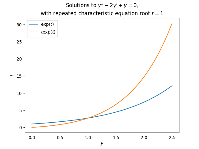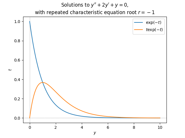 \(\text{ }\) Repeated root We have now found all solutions to second order linear autonomous equations whose characteristic equation as distinct roots (whether they are real or complex - including if the ODE has complex coefficients and/or initial conditions). But our results break down when \(\rho=r_{1}=r_{2},\) i.e. when the characteristic polynomial is \[(r-\rho)^{2}=r^{2}+\underset{=a_{1}}{\underbrace{(-2r)}}\rho+\underset{=a_{0}}{\underbrace{\rho^{2}}.}\tag{5.66}\] In this we do have that \(y(t)=e^{\rho t}\) is a solution to the homogeneous equation, but we don’t have a second solution of this form since \(r_{1}=r_{2}.\) Also for instance the argument ([eq:ch5_so_lin_aut_real_roots_all_sols_matrix_vec]) breaks down. However, a close inspection of ([eq:ch5_so_lin_aut_real_roots_all_sols_z_comp_start])-([eq:ch5_so_lin_aut_real_roots_all_sols_z_comp_start]) shows that that argument doesn’t depend on \(r_{1}\ne r_{2}.\) The identity ([eq:ch5_so_lin_aut_real_roots_z_fo_ODE]) with \(r_{1}=r_{2}\) proves that for any solution \(y(t)\) it holds that \[\frac{d^{2}}{dt^{2}}\left\{ e^{-\rho t}y(t)\right\} =0,\] which implies that \[\frac{d}{dt}\left\{ e^{-\rho t}y(t)\right\} =c,\] for some constant \(c,\) which then in turns implies that \[e^{-\rho t}y(t)=a+ct\] for some \(a,c\in\mathbb{C}.\) This is equivalent to \[y(t)=ae^{\rho t}+cte^{\rho t}.\] The term \(ae^{\rho t}\) is the solution we already have, but \(cte^{\rho t}\) is new. We can use it as ansatz to double-check if this is a solution: If \(y(t)=te^{\rho t}\) then \(y'(t)=e^{\rho t}+\rho te^{\rho t}\) and \(y''(t)=2\rho e^{\rho t}+\rho^{2}te^{\rho t},\) so \[\begin{array}{l} y''+a_{1}y'+a_{0}\\ =2\rho e^{\rho t}+\rho^{2}te^{\rho t}+a_{1}\left(e^{\rho t}+\rho te^{\rho t}\right)+a_{0}te^{\rho t}\\ =e^{\rho t}t\left(\rho^{2}+a_{1}\rho+a_{0}\right)+\left(2\rho+a_{1}\right)e^{\rho t}. \end{array}\tag{5.67}\] Since \(\rho\) is a solution to the characteristic equation \(\rho^{2}+a_{1}\rho+a_{0}=0,\) so the first term vanishes. The second term also vanishes due to the form of \(a_{1}\) for these ODEs, from ([eq:ch5_so_lin_aut_repeated_root]). Thus indeed \(te^{\rho t}\) is a solution, and so is then any linear combination \(\alpha e^{\rho t}+\beta te^{\rho t}.\) When the coefficients \(a_{1},a_{0}\) are real the repeated root is also real, and then \(te^{\rho t}\) is a term that for small \(t\) is close to zero - unlike \(e^{\rho t}\) - and for large \(t\) decays to zero slightly slower than \(e^{\rho t}\) if \(\rho<0\) or grows slightly faster if \(\rho>0.\)