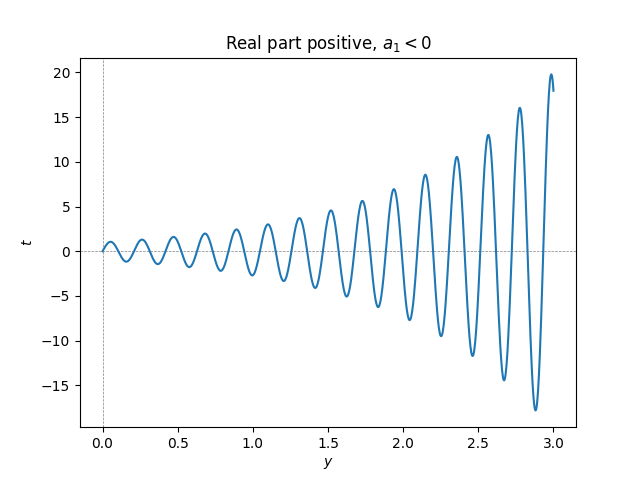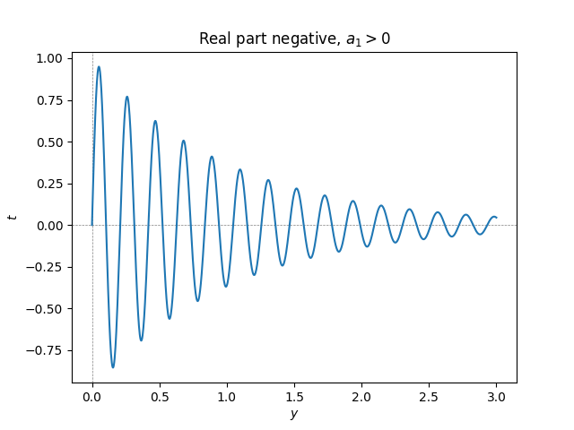 \(\text{ }\) Non-real roots. We have completely solved the class of second order linear autonomous ODEs with characteristic equation with distinct real roots. Now let us investigate ODEs with no real roots.