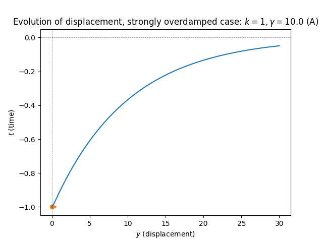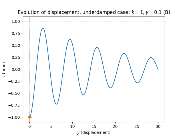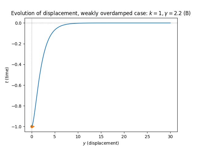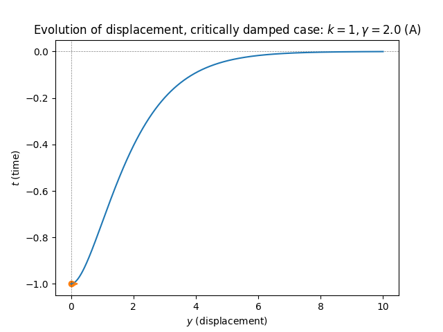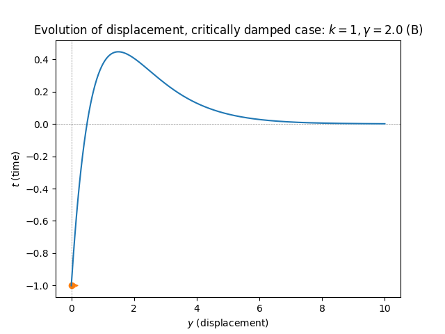 In this case the displacement simply decays - at a slower rate than in the overdamped case, but fast enough to prevent oscillation (plot A). However if the initial condition provides enough energy, e.g. by not starting at rest but rather at a positive velocity such as \(y'(0)=\frac{3}{3}\gamma,\) the displacement can cross the axis exactly \(y=0\) once, before settling in to a monotonic decay towards the neural position \(y=0\) (plot B).