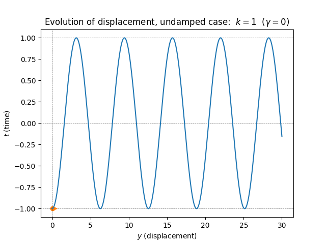 \(\text{ }\) Without friction - undamped case. Let us assume that there is no friction, i.e. \(\gamma=0.\) This is called an undamped spring. Then the ODE reduces to \[y''(t)+ky(t)=0.\tag{5.78}\] By the results of the previous section all solutions of this ODE are of the form \[y(t)=\alpha\cos(\sqrt{k}t+s),\tag{5.79}\] i.e. sinusoids of frequency \(\sqrt{k}\) and any amplitude and phase. If we for instance assume that the spring is initially compressed a distance of \(1\) length units, so that \(y(0)=-1,\) and released from there from rest so that \(y'(0)=0,\) we should impose the initial conditions \[y(0)=-1\text{ and }y'(0)=0.\tag{5.80}\] Since \(y'(t)=\alpha\sin(\sqrt{k}t+s)\) so \(y'(0)=\alpha\sqrt{k}\sin(s)=0\) if \(s=0,\) while \(y(0)=\alpha\cos(s)=-1\) if \(s=0,\alpha=-1,\) we obtain the solution \[y(t)=-\cos(\sqrt{k}t),\tag{5.81}\] which is plotted in this figure: