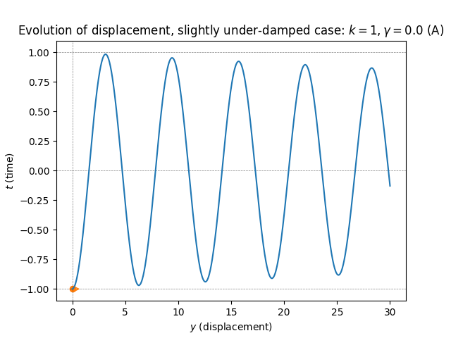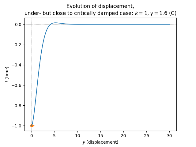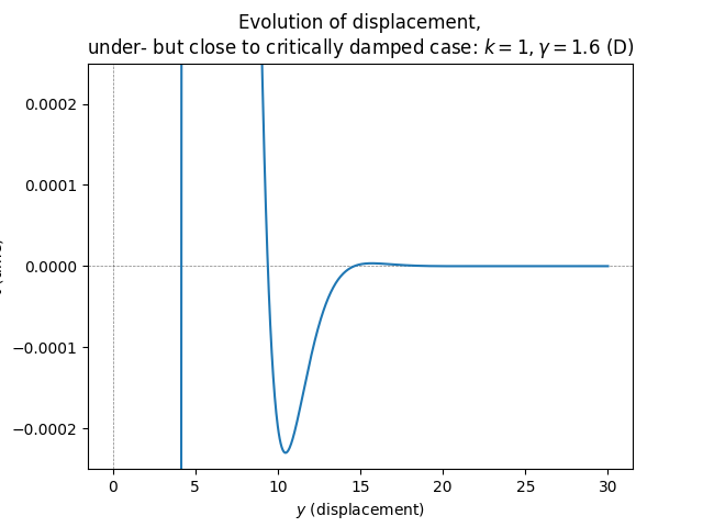 If \(\gamma\) is below \(2\sqrt{k}\) but very close to it, the oscillation decays very fast, and becomes almost imperceptible after only a few periods (plot C). The frequency is also reduced, tending to zero as \(\gamma\uparrow2\sqrt{k}.\) Still, the solution does cross the neutral position \(y=0\) an infinite number of times, as one can be seen by zooming in (plot D).