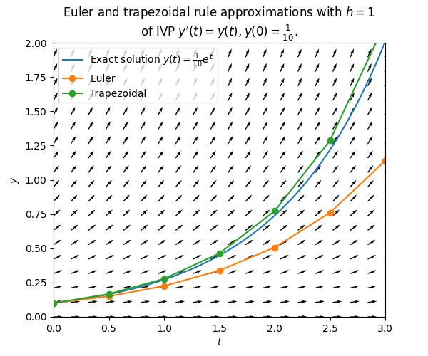 \(\text{ }\) Trapezoidal rule method for ODEs. Inspired by this, we can build a numerical method for first order ODEs by applying the approximation ([eq:ch9_trap_heuristic_derivation_approx_one_interval]) to \(y_{n+1}-y_{n}=\int_{t_{n}}^{t_{n+1}}F(t,y(t))dt,\) yielding \[\int_{t_{n}}^{t_{n+1}}F(t,y(t))dt\approx h\frac{F(t_{n},y(t_{n}))+F(t_{n+1},y(t_{n+1}))}{2},\] and thus \[y_{n+1}=y_{n}+h\frac{F(t_{n},y_{n})+F(t_{n+1},y_{n+1})}{2}.\tag{9.31}\] The last equation is the trapezoidal rule method for numerically approximating solutions to ODEs. Note that it differs from Euler’s method ([eq:ch9_euler_method_def_one_step]) in that it specifies \(y_{n+1}\) in terms of \(y_{n}\) implicitly. That is, \(y_{n+1}\) is defined as a solution of the equation \[y=y_{n}+h\frac{F(t_{n},y_{n})+F(t_{n+1},y)}{2}.\tag{9.32}\] The next plot compares the exact solution of an ODE to the approximation by the trapezoid rule method and Euler’s method for the same step-size.