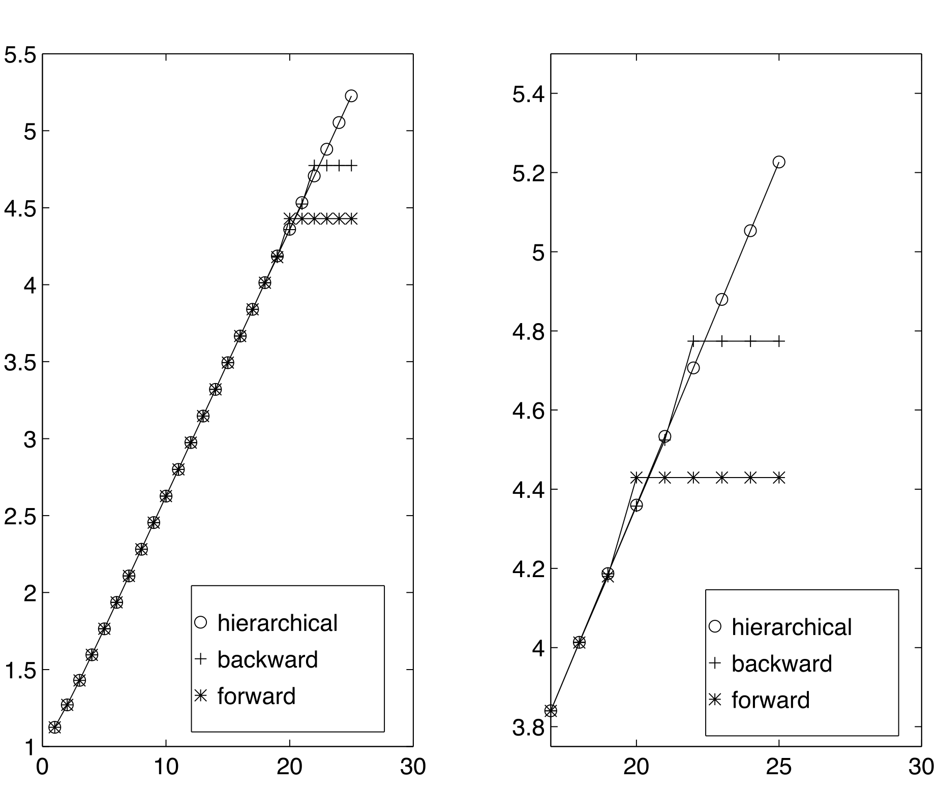Figure 4.1: Difference between forward, backward, and hierarchical summation for \(m=0,\ldots,25.\) The right picture zooms into the left picture.