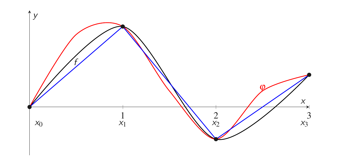 Our goal is to construct a function \(\varphi\in C([a,b]),\) which is intended to approximate \(f\) as well as possible. The minimal requirement we have is that \(\varphi\) fulfills the so-called interpolation conditions \[\tag{7.4} \varphi(x_i) = f(x_i)\, , \qquad i = 0, \ldots, n\, .\]