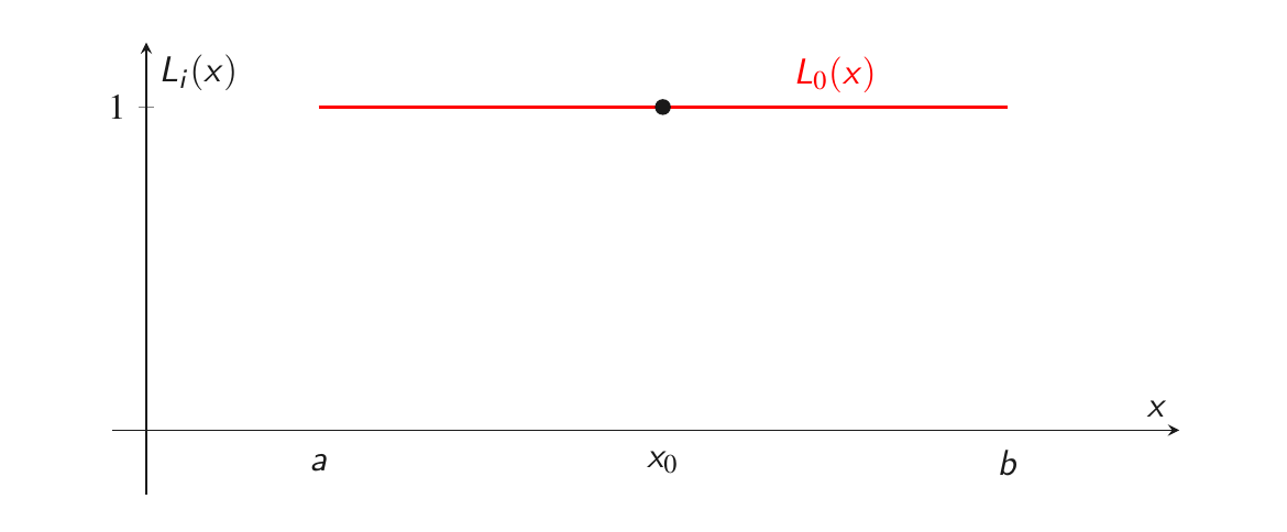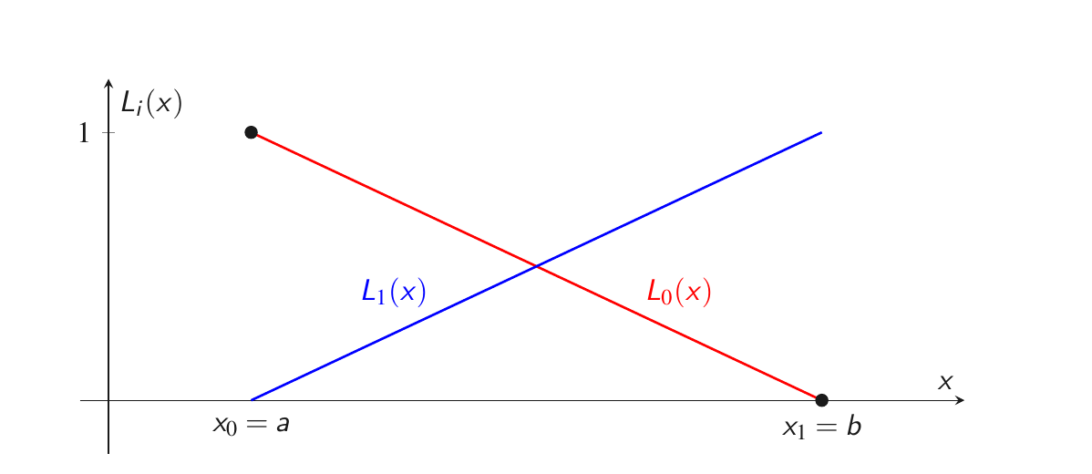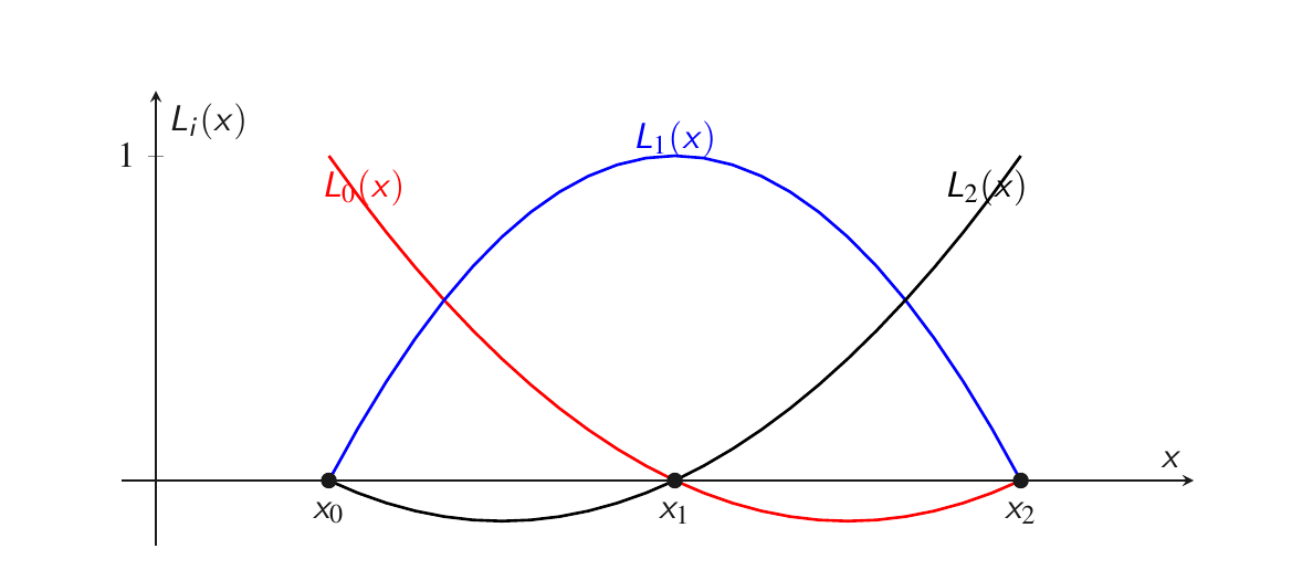 Here, we have used the Kronecker-\(\delta\) \[\tag{7.7} \begin{aligned} \delta_{ij} =\left\{\begin{aligned}1 &, \, i=j\\ 0 &,\, i\not= j\end{aligned}\right. \end{aligned}\] The Lagrangian basis functions can be written as \[\tag{7.8} L_i^n(x)\;=\;\prod_{\substack{k=0\\k \neq i}}^n\, \frac{x-x_k}{x_i-x_k},\qquad i=0, \ldots, n.\] In particular, we have that \[\tag{7.9} p_n(x) = p(x_0, \ldots, x_n|f) \;=\; \sum_{i=0}^n f(x_i)L_i^n(x)\, .\] Please note that in Equation (7.9) the values \(f(x_i)\) are the coefficients of \(p_n\) with respect to the Lagrangian basis.