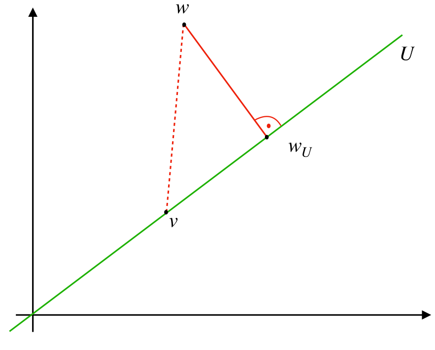 We call \(w_U\) the orthogonal projection of \(w\) into \(U\) and refer to Figure 11.1 for a graphical representation.