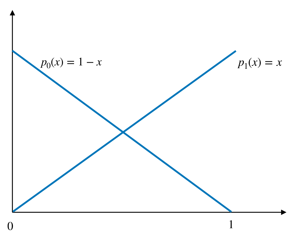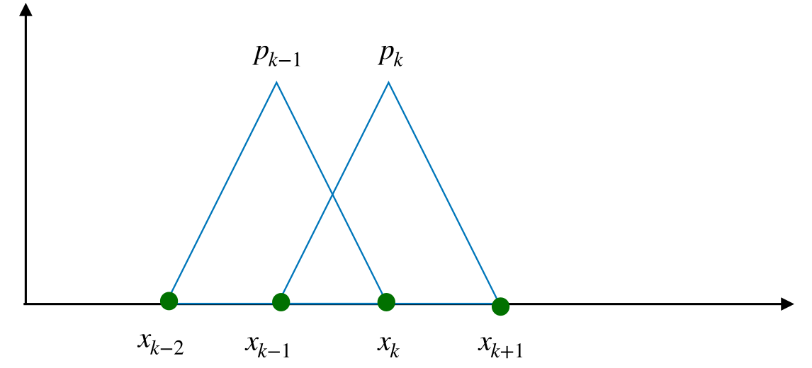 Figure 10.2 illustrates this connection process: two Lagrangian basis functions (left picture) get connected, such that the resulting (hat) function (right picture) is continuous. We call the hat functions also nodal basis functions.